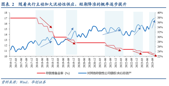 结论:事实上9月以来,央行不断通过大量的逆回购投放来提供流动性,当下对其他存款性公司债权(用来衡量逆回购,MLF以及结构性工具余额的科目)占央行总资产的比重为37.7%,是有数据以来的最高值。2018年以来,稳增长压力较大的时间段,只要对其他存款性公司债权占央行总资产的比重抬升,央行大概率会降准。我们提示,债权工具大量投放的背景下,年内央行降准仍然值得期待。